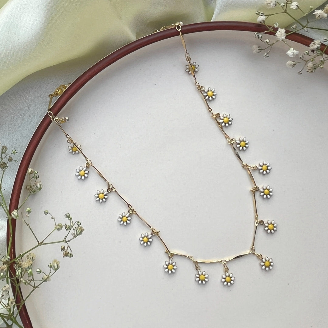 This charming and playful piece features a delicate, gold-toned chain intermittently accented with beautifully crafted white enamel daisy charms that dangle freely. Each daisy, with its bright yellow center, mimics a field of flowers on a sunny day. Designed to sit elegantly as a choker or collar-length necklace, it adds a cheerful, whimsical, and effortlessly stylish touch to any outfit, from casual wear to summer dresses.