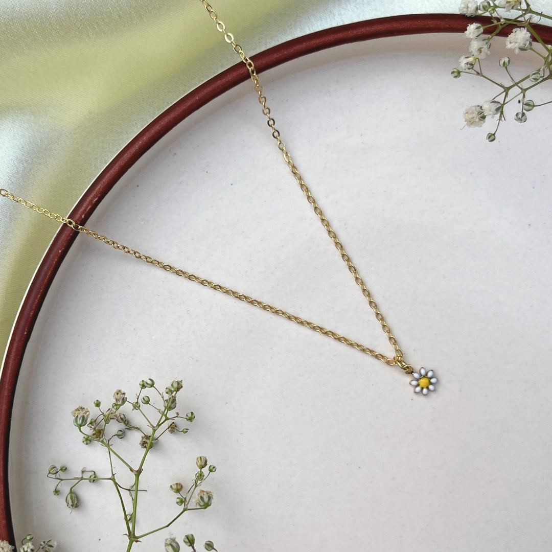 Add a touch of sunshine to your style with our Daisy Bloom Pendant Necklace β a charming piece that captures the essence of joy and simplicity. This delicate necklace features a petite daisy charm with a bright yellow center and white enamel petals, suspended from a sleek gold-plated chain.