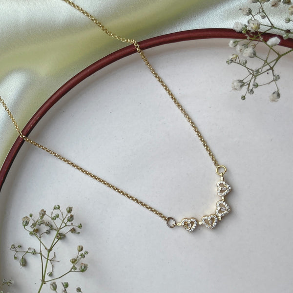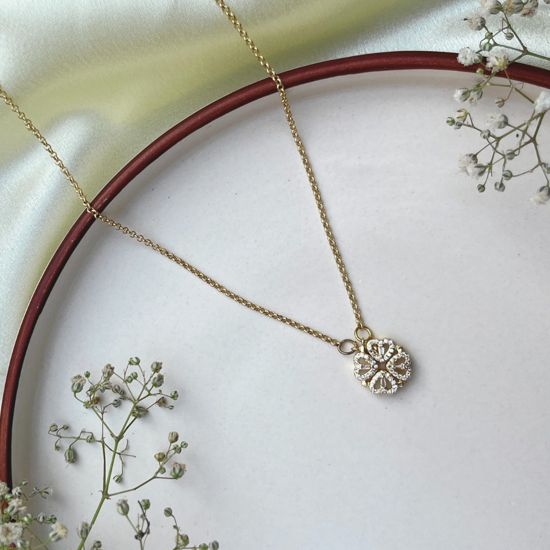 Discover true versatility with our Duet Heart Clover Necklace. This ingenious piece features a dazzling pendant completely encrusted with brilliant Zircon crystals, designed to be worn in two stunning ways.