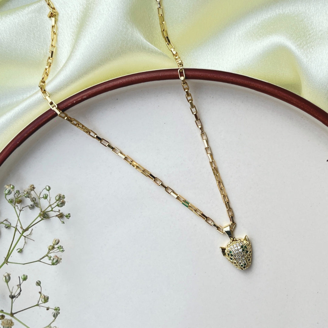 Make a bold statement with the magnificent Emerald Panther Necklace. This iconic pendant features a meticulously crafted panther or leopard head, symbolizing strength, elegance, and confidence. The design is brought to life with brilliant, pave-set white Zircon crystals, while the eyes are set with striking emerald green Zircon stones for a powerful pop of color.