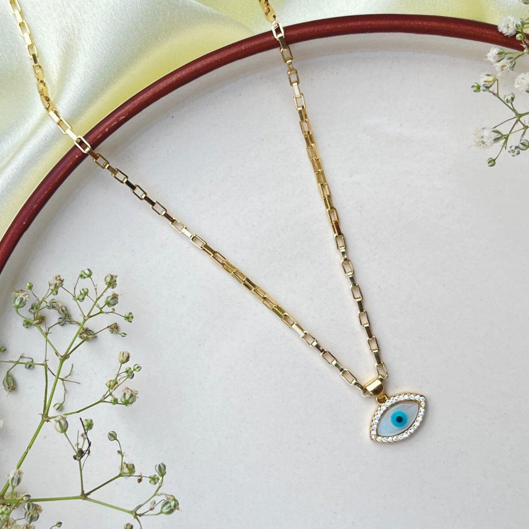 Wear a symbol of protection and style with our Gaze Protector Necklace. This captivating piece features a beautifully rendered Evil Eye pendant, centered with a vibrant blue pupil and surrounded by a ring of delicate white enamel. The entire eye shape is meticulously outlined with brilliant, pave-set Zircon crystals, offering a constant sparkle.