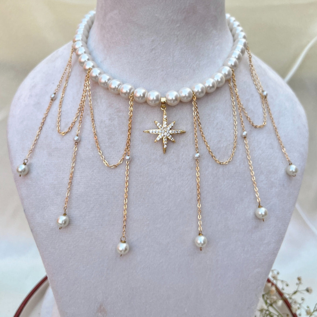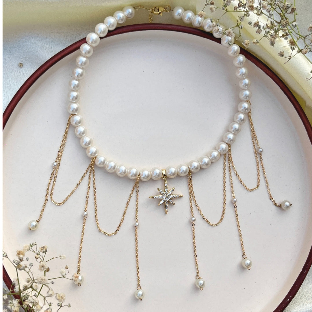 Introducing the Gracefall Necklace, an exquisite piece that embodies timeless elegance and enduring quality. This stunning design features a delicate gold chain draped with lustrous, high-quality pearls that catch the light with every movement. The centerpiece is a radiant charm, meticulously set with sparkling Zircon crystals, adding a touch of brilliant luxury to the fluid design.