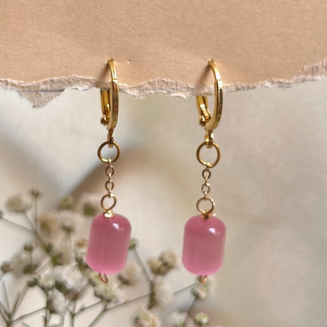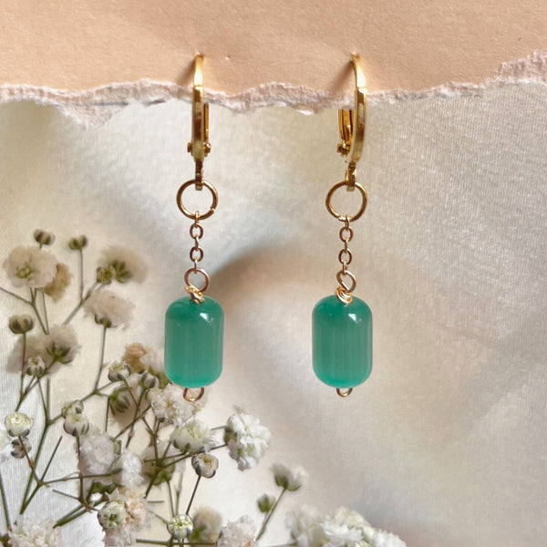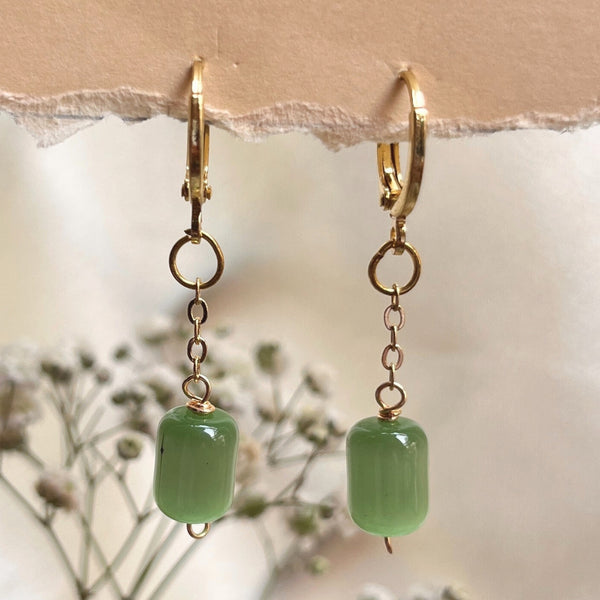 Each earring is designed for a sleek, streamlined look. The focus is on the beautiful, translucent color of the capsule-shaped bead. The bead hangs from a delicate anti-tarnish gold-colored chain, which is anchored by a secure lever-back closure. The anti-tarnish feature ensures your earrings maintain their brilliant gold tone without fading or discoloration.