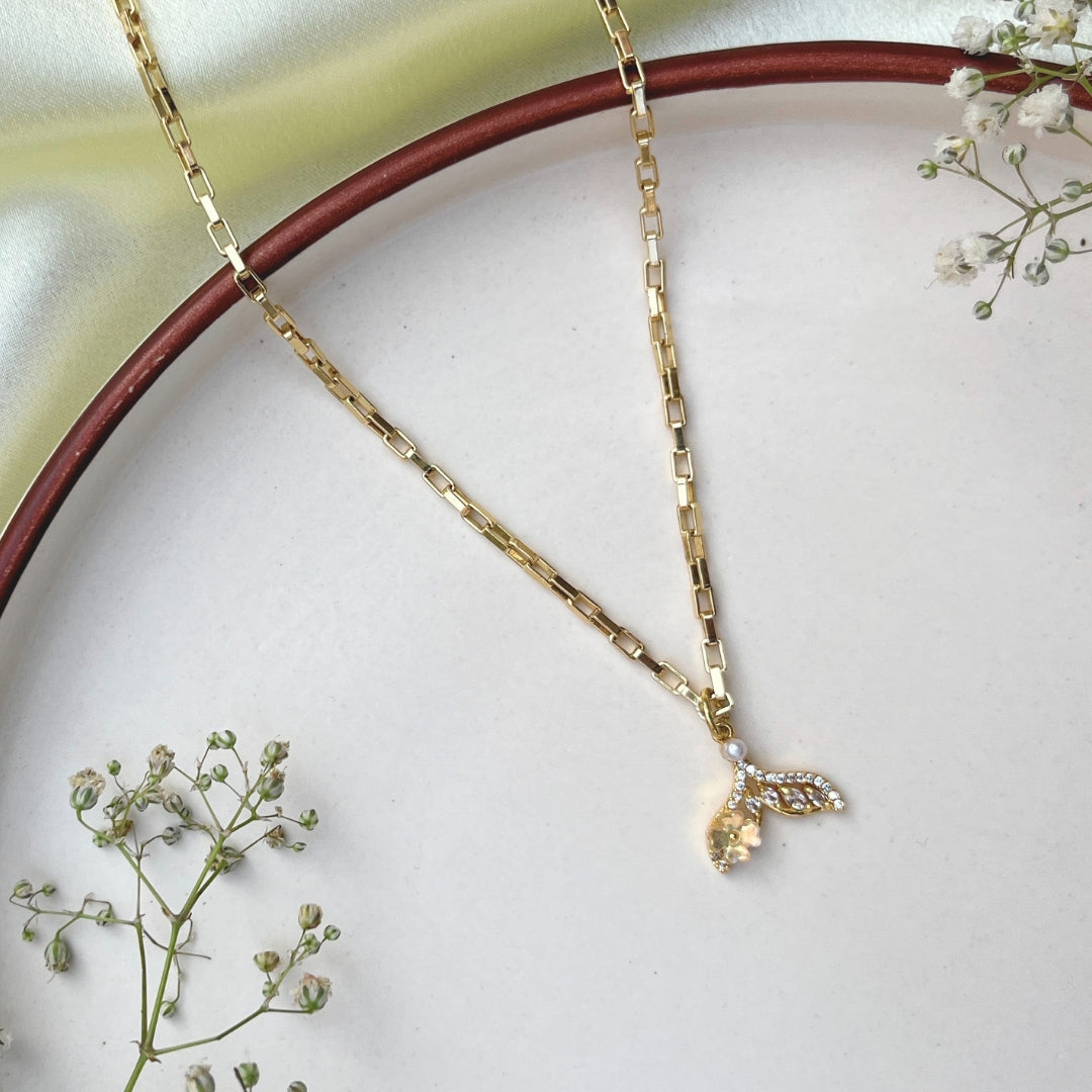 Embrace the magic of the sea with the Ocean Whispers Necklace. This beautifully crafted pendant features a detailed whale or mermaid tail, symbolizing strength, good fortune, and a free spirit. One side of the tail shimmers with pave-set Zircon crystals, while the other is adorned with a delicate white flower or pearl accent, adding a unique, luxurious touch.