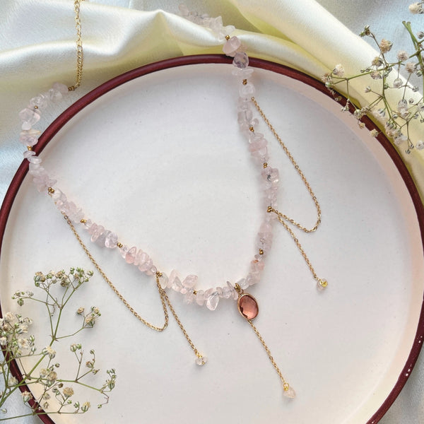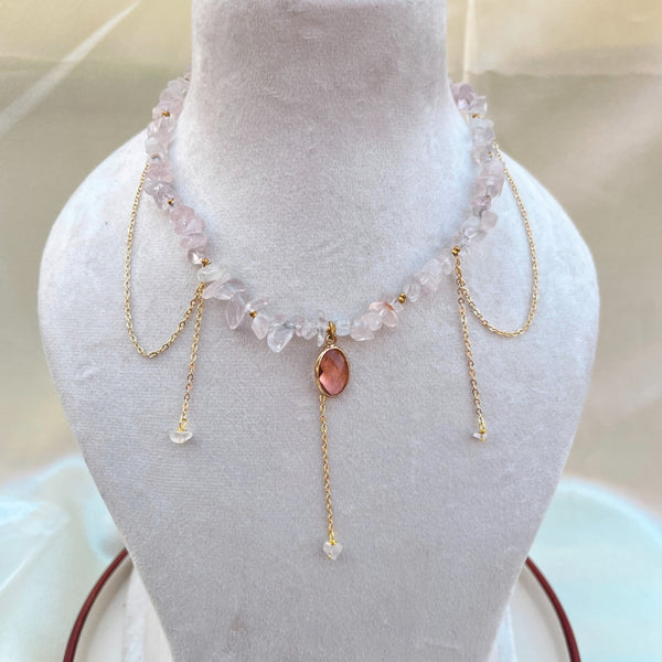 This beautifully feminine choker necklace offers a blend of natural elegance and whimsical movement. It is crafted from a strand of raw, tumbled Rose Quartz chips, giving the piece a gentle, pale pink hue and a unique, organic texture.